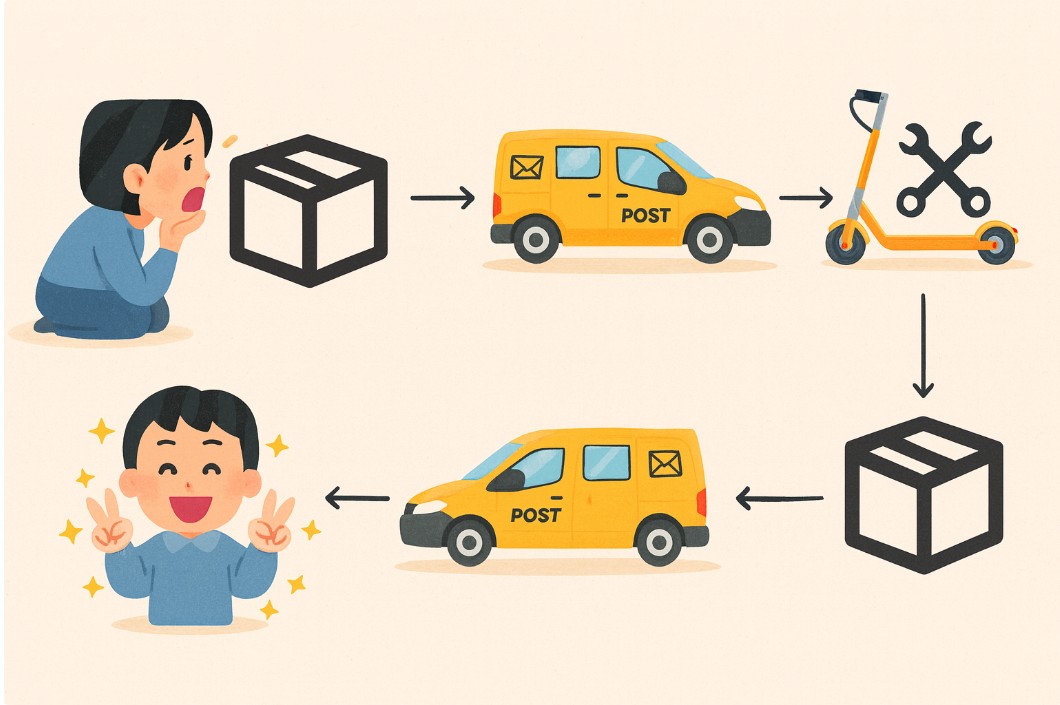 Sie verpacken Ihren E-Scooter in einem geeigneten Paket. Falls Sie kein passendes Paket haben, können Sie dieses bei uns erwerben . Wir senden es Ihnen zu. Ein GLS-Versandlabel können Sie ebenfalls bei uns kaufen. Legen Sie den E-Scooter in das Paket und senden Sie ihn an uns. Nach der Reparatur verpacken wir den E-Scooter im selben Paket und schicken ihn an Sie zurück. So einfach ist das!